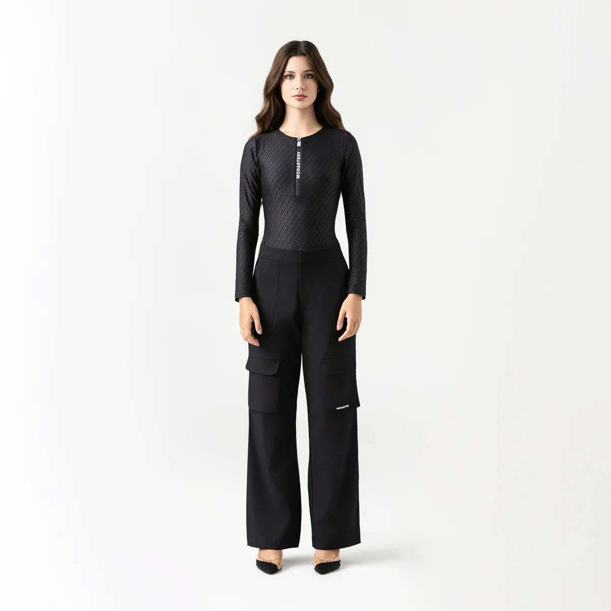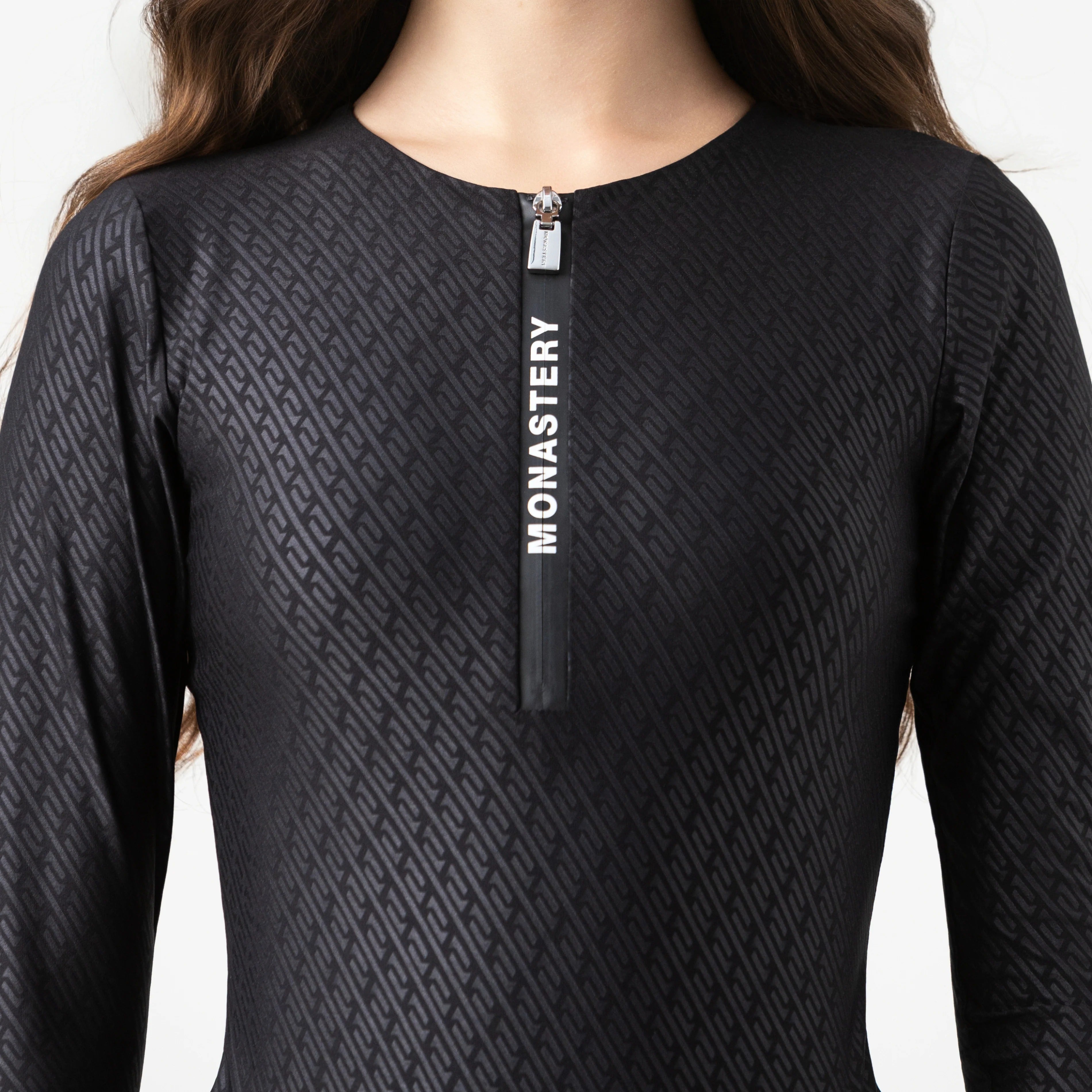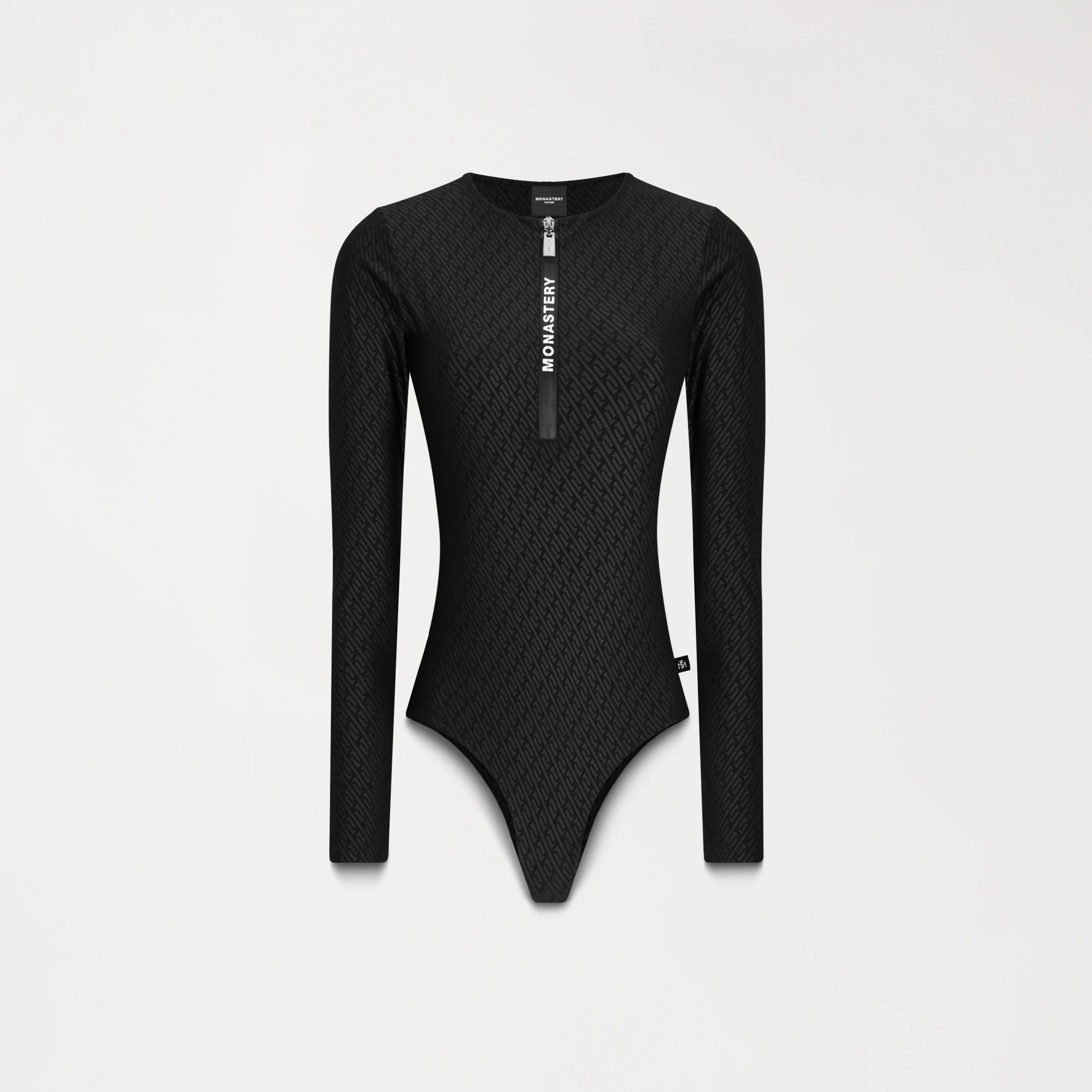 Elaborado en tela exclusiva con textura contramarcada Monastery, este body aporta profundidad visual y una identidad táctil reconocible. Cuenta con cierre frontal con cremallera impermeable y contramarcada, que garantiza un ajuste funcional sin comprometer el diseño. En la espalda, un estampado plano con el logo insignia refuerza la presencia gráfica de la prenda. Una pieza pensada para movimiento, estilo y atención al detalle.