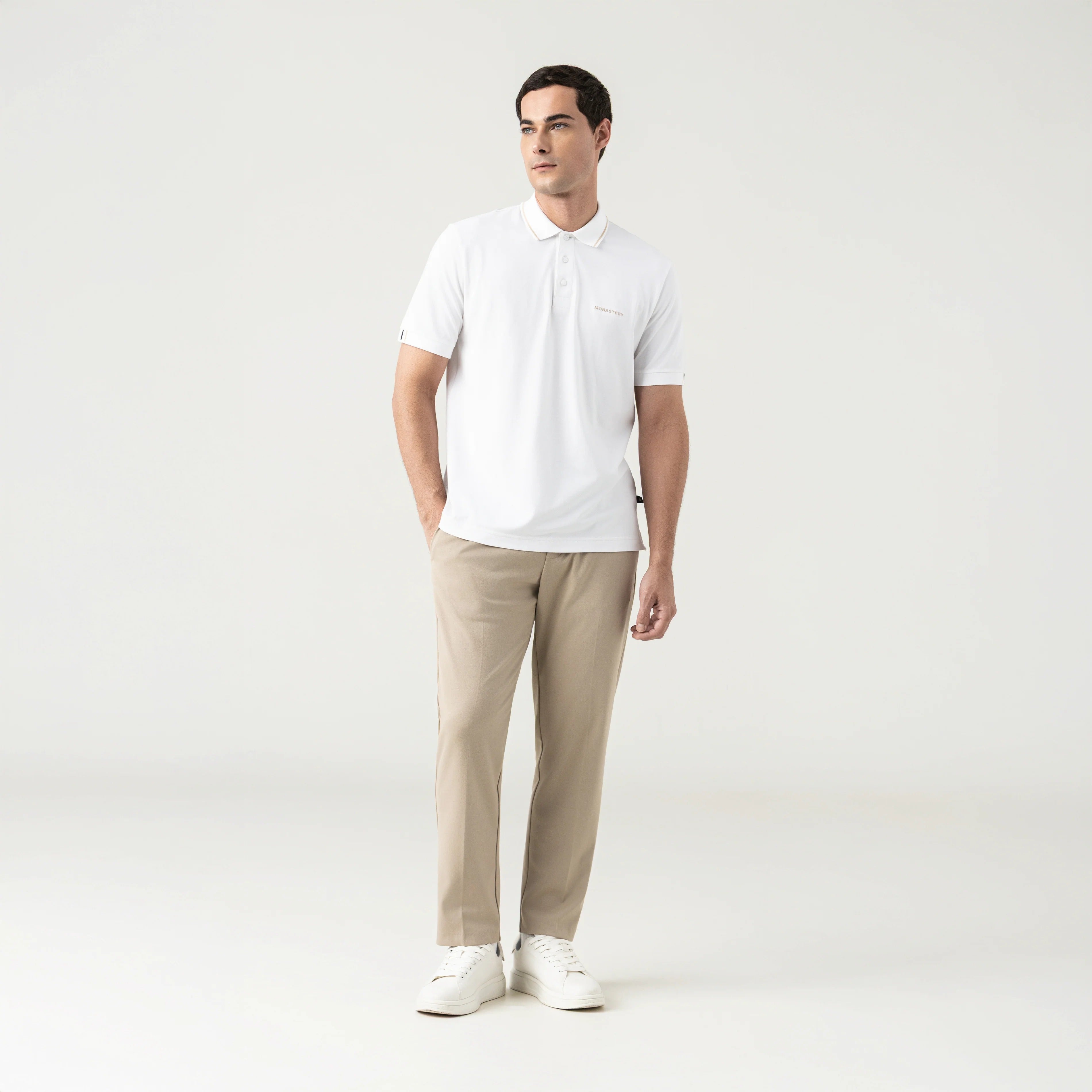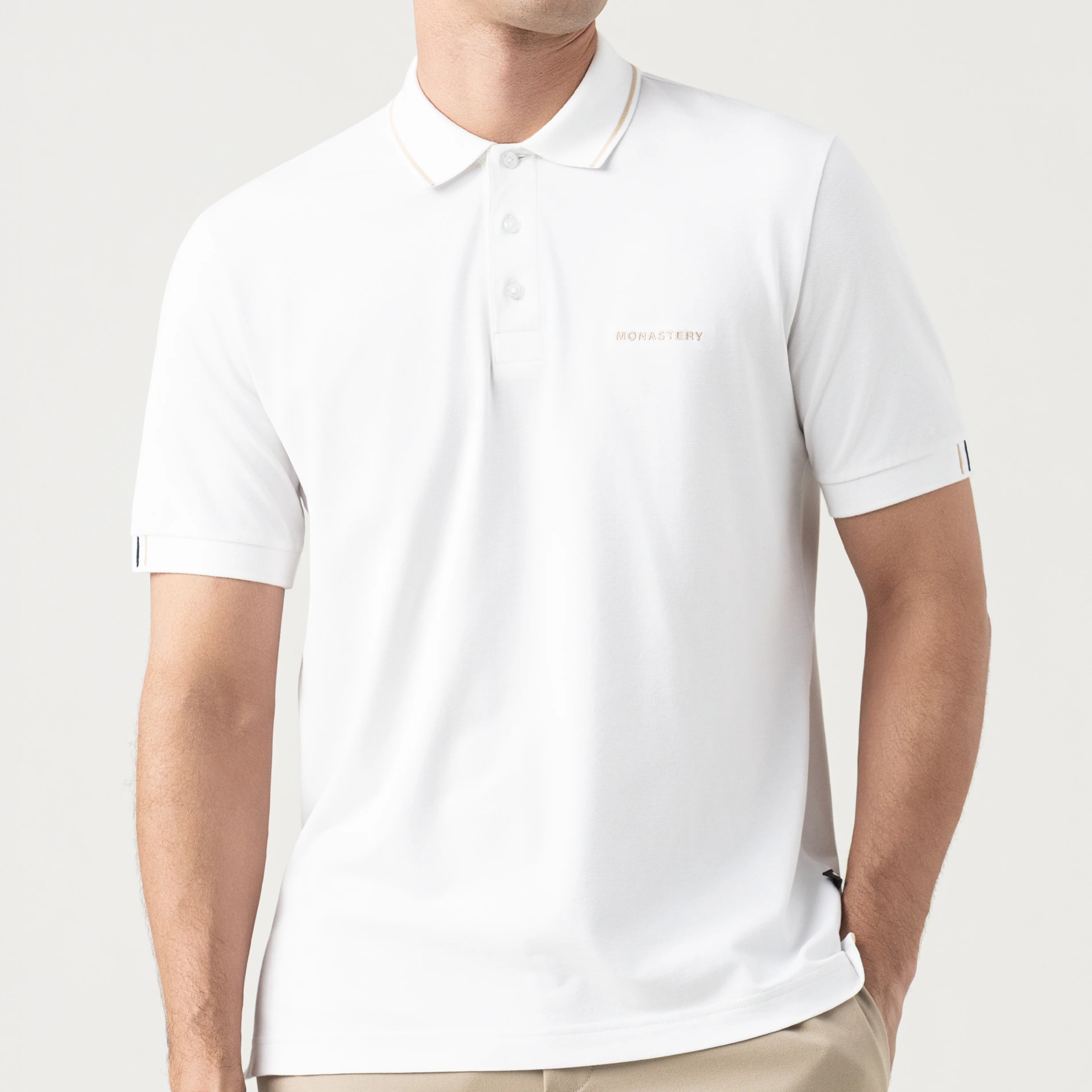 La Marengo es una polo masculina de silueta regular, confeccionada en algodón 100% pima peruano exclusivo para Monastery, pensada para quienes valoran los detalles sutiles y la sofisticación discreta. El cuello tejido con tipping en contraste y el tapacuellos interno aportan un acento distintivo, mientras que el bordado frontal del logo Monastery y las líneas bordadas en los puños refuerzan la identidad de la marca. La espalda combina estampado en alta densidad con bordado plano, creando textura y presencia visual sin perder elegancia. Los botones contramarcados completan la prenda, que eleva lo casual con refinamiento y estilo contemporáneo.